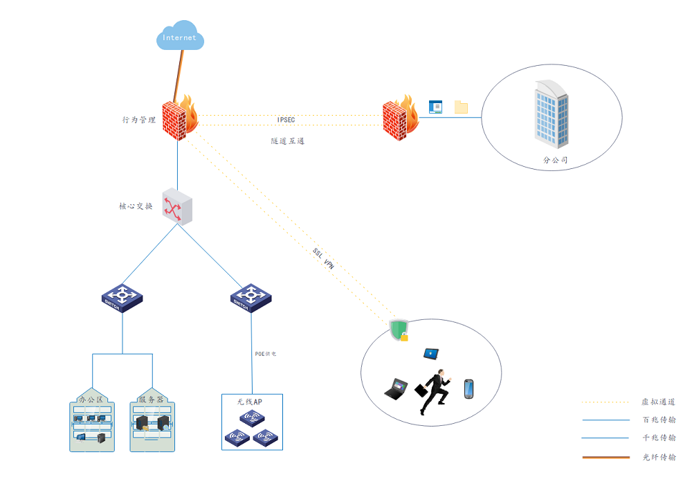整体网络框架采用全千兆多WAN口防火墙+千兆交换机+AC无线部署模式,为后续公司发展提供可升级空间。核心三层交换机背板带宽大,实现主机千兆对网络千兆传输,发挥最大传输速率。