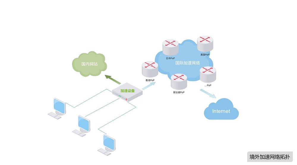 如仅做是一般境外加速,可以采用境外专线置于出口网关顶层或者作为有需求的部门网络顶层设备,通过策略走向实现最优选路,提高访问速度,达到加速效果。