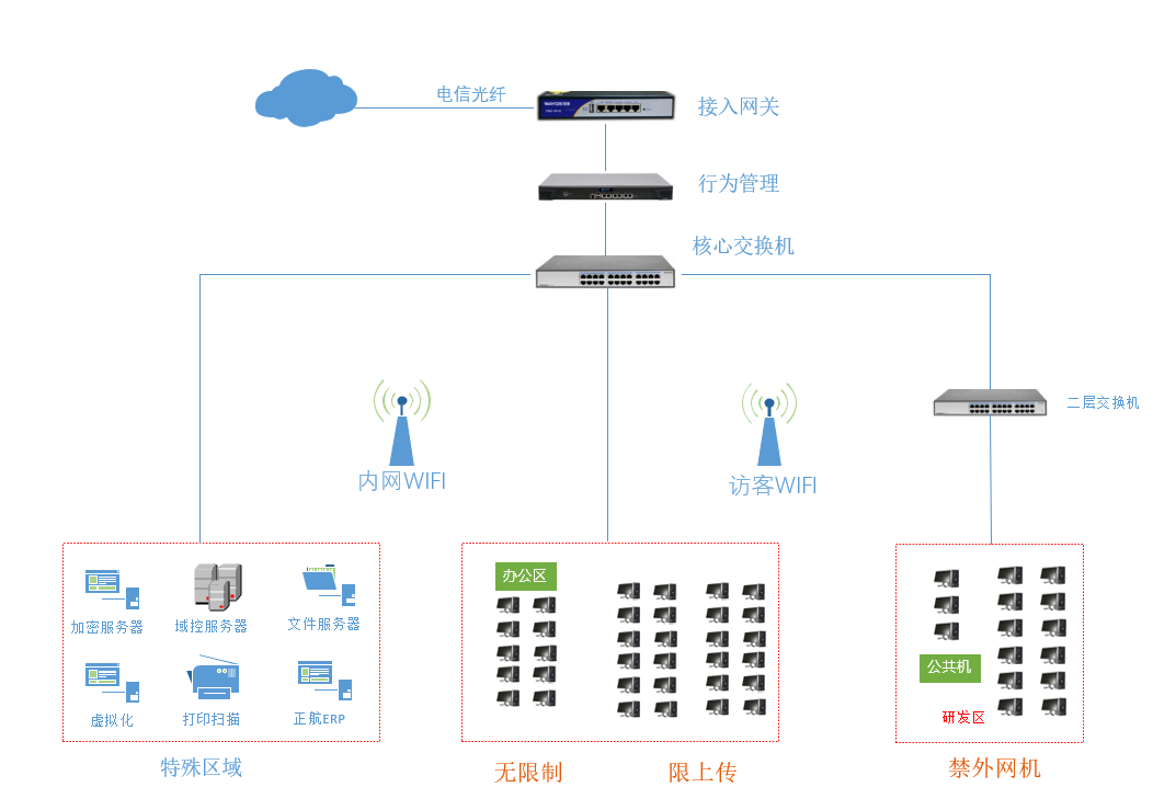 制造业的网络架构设计主要体现在不同的工作区域其网络之间的互访规则,如在普通办公区的网络作为一般的网络是无法与研发设计区域的网络互通数据,可以通过内部相关软件通讯;流水线作业区域的网络访问级别更低,仅能允许部分应用访问互联网,因该区域已经设计到相关机密信息。访客网络完全与局域网隔离,保障公司内网安全。